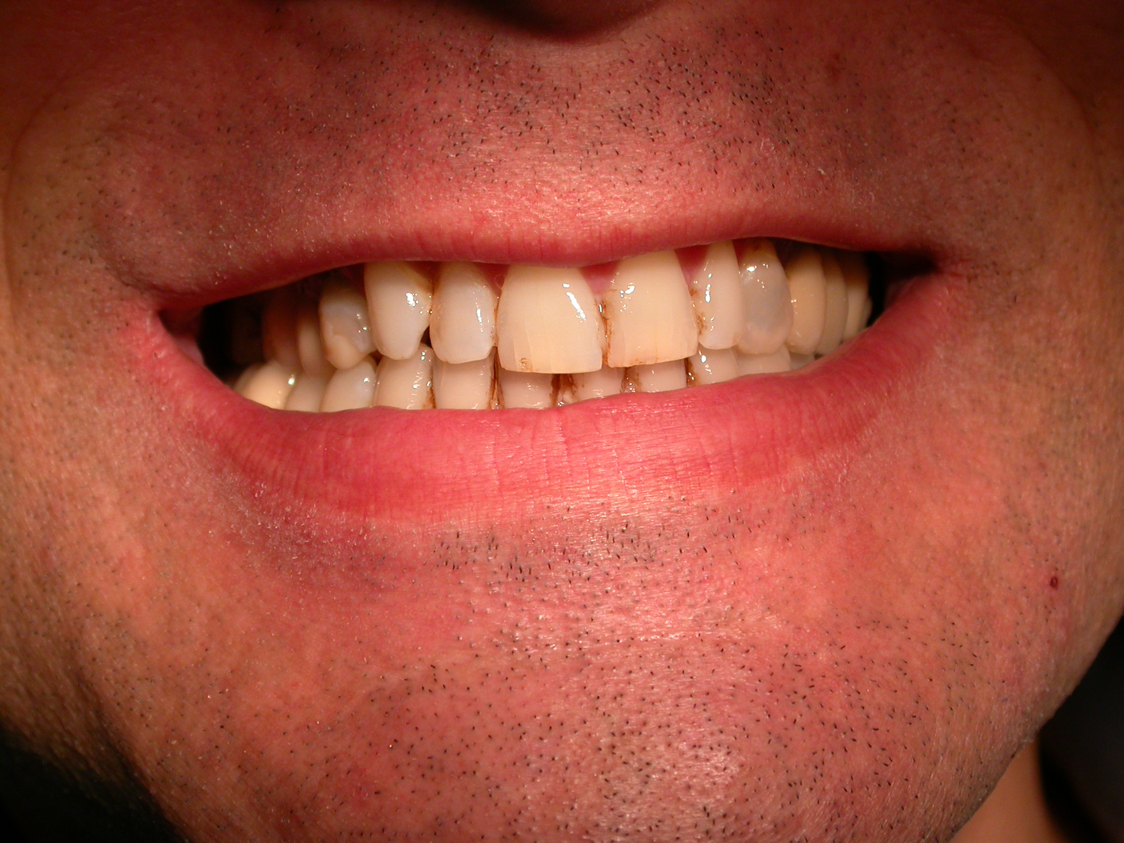 Paziente con problemi nel sorridere, per colore e forma diversi dei denti.