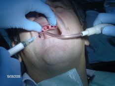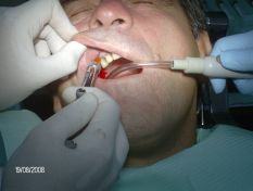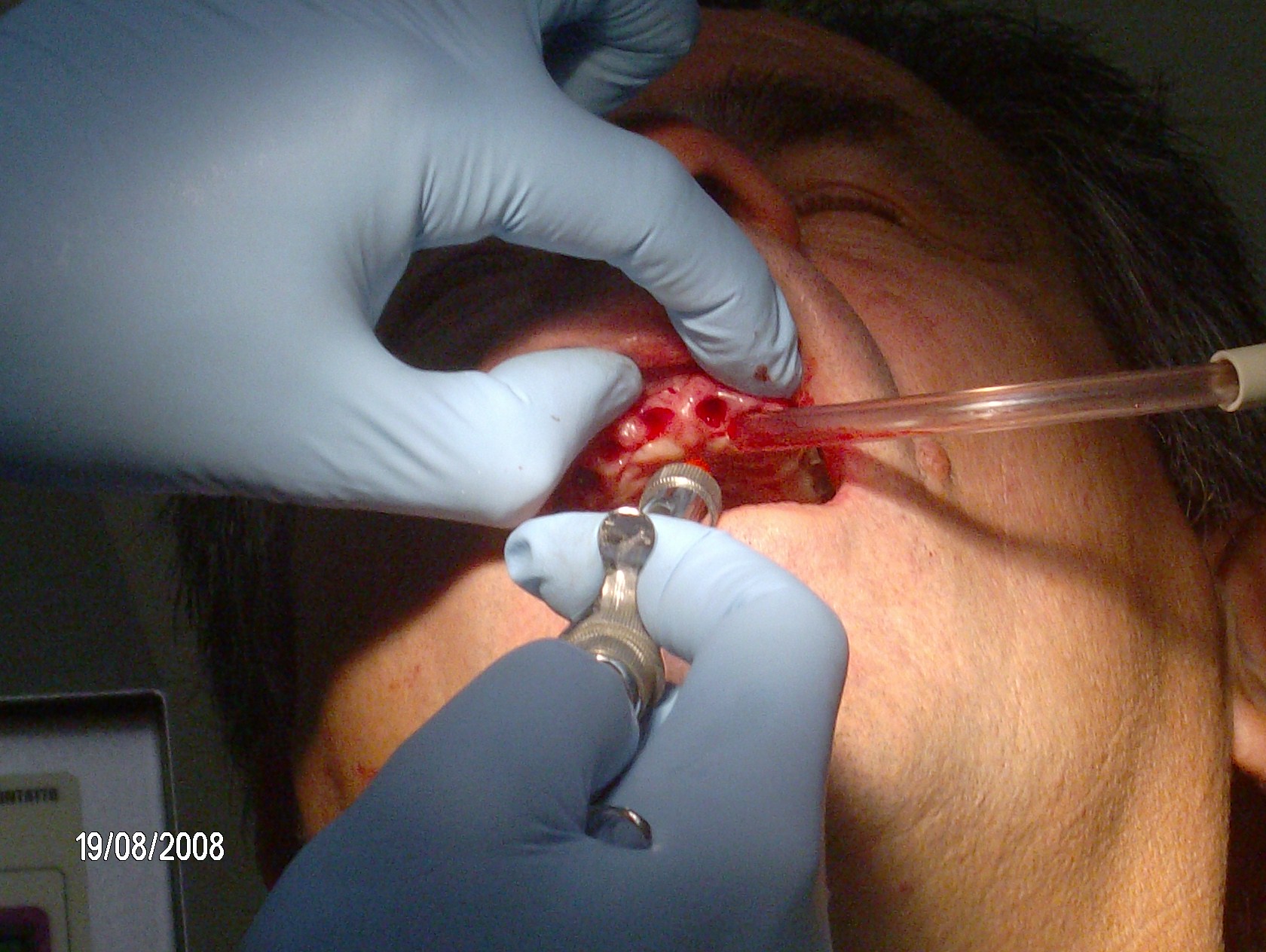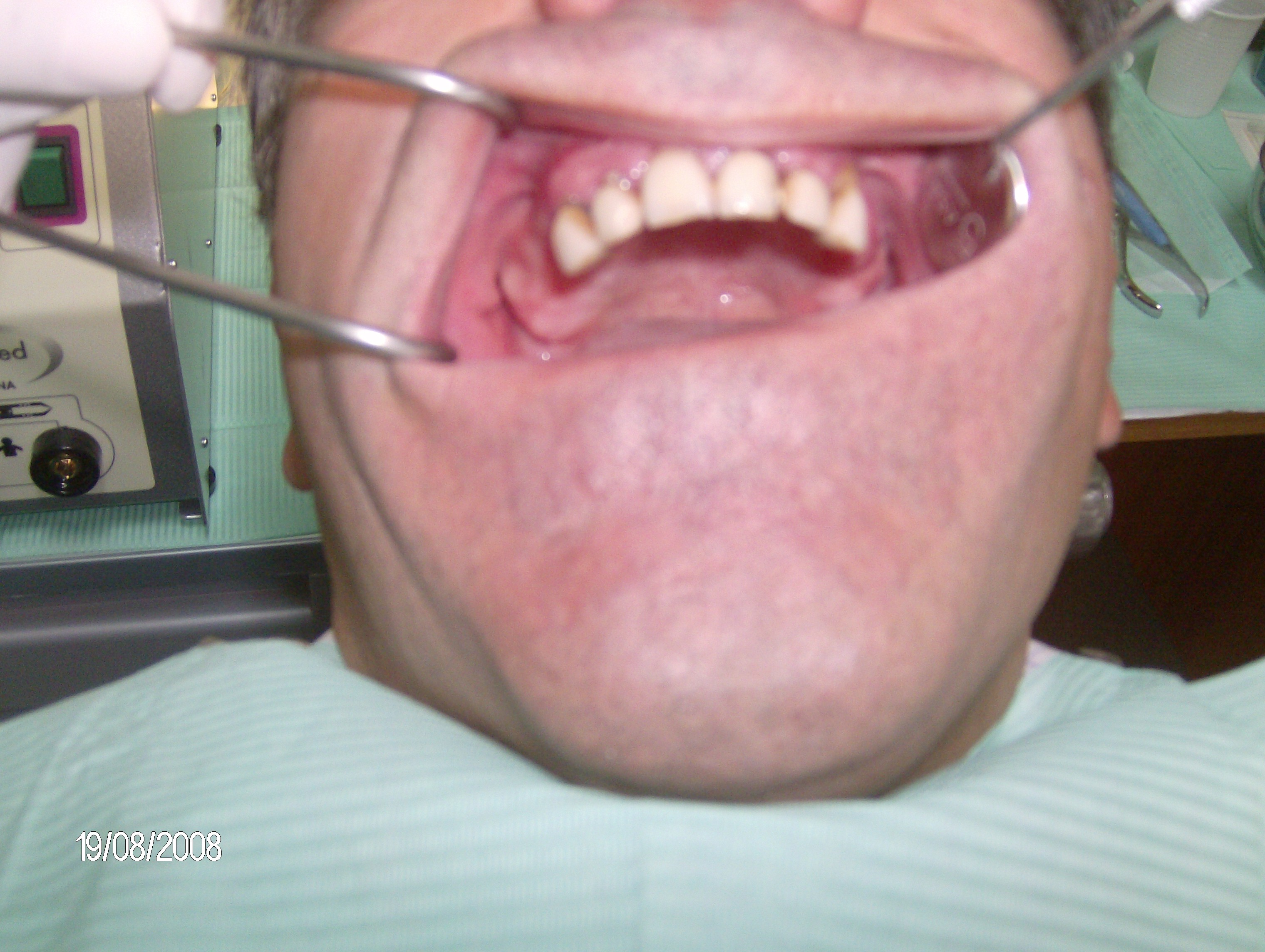 Viene effettuata una seduta operatoria con inserimento di 9 impianti postestrattivi in arcata superiore sincristallizzati con protesi fissa in resina di lunga durata ( 4 ore di intervento)