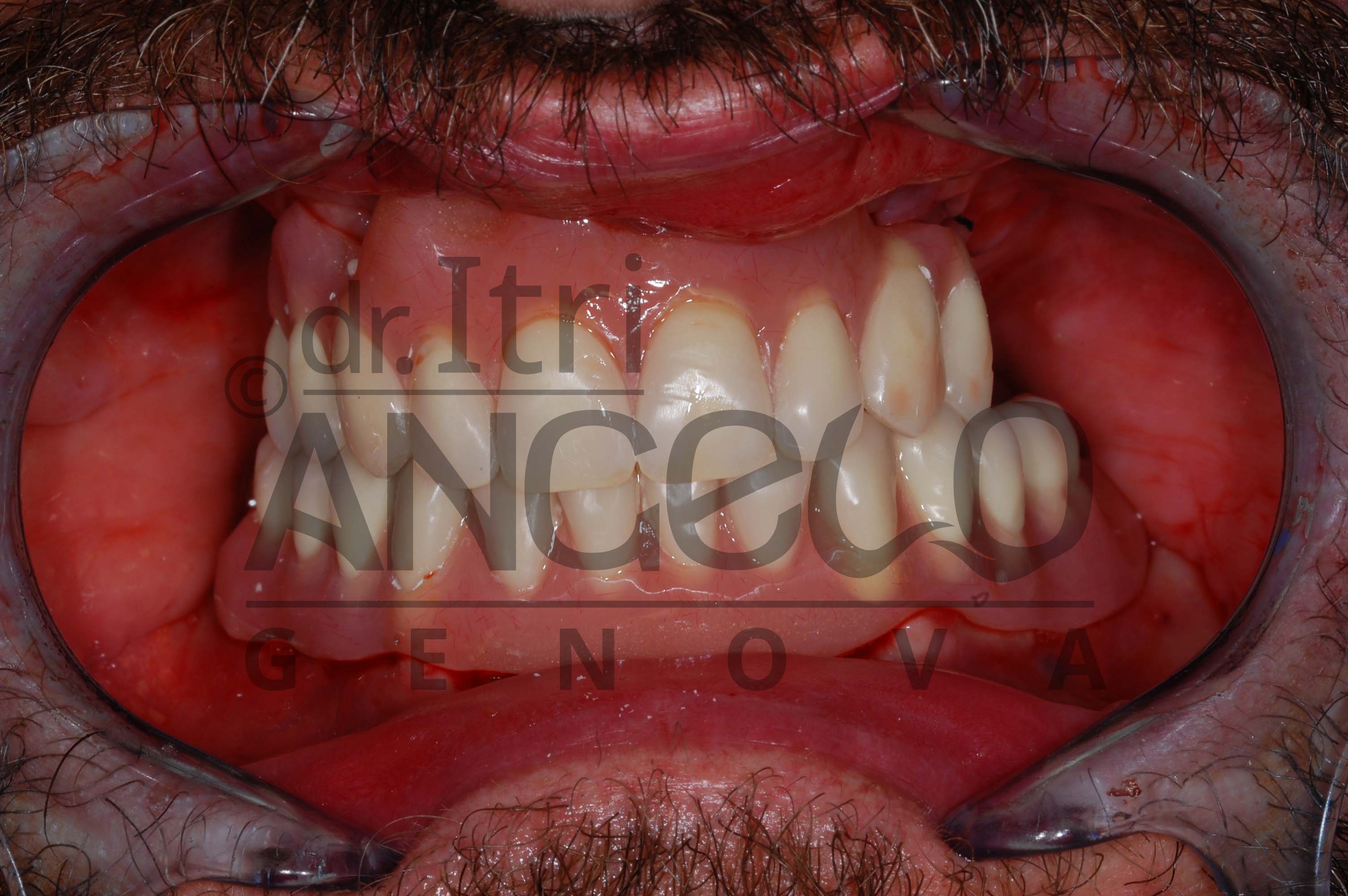 1. prima seduta: estrazione di tutti gli elementi dentali presenti, installazione degli impianti dentali superiori e della protesi fissa diretta (cioè adattata dal clinico in seduta senza far attendere 24-48 ore per la sua consegna) superiore; inferiormente è stata posizionata una protesi mobile totale (dentiera) che verrà adattata in un secondo momento in maniera fissa; in questa fase ho riscontrato l'impossibilità di caricare immediatamente uno dei 5 impianti a causa di fattori anatomici sfavorevoli; per questo non si è potuto procedere alla realizzazione di una protesi superiore stabile immediata; con questo tipo di progettazione, e avvisando il paziente, si procederà ad eseguirla dopo 4 mesi.