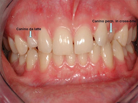 Situazione iniziale: il canino di destra e' da latte; mentre quello superiore sinistro e' in cross-bite.