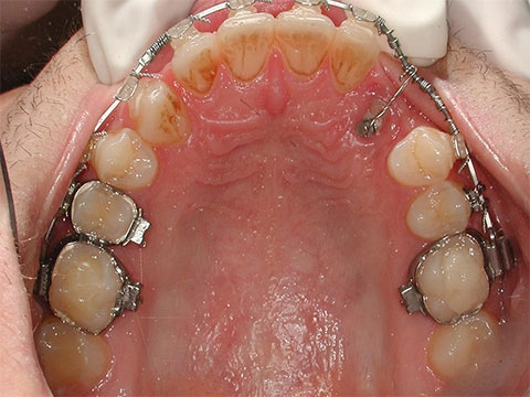 Si nota il sottile filo metallico che collega il bottone sul canino, con il resto dell'apparecchiatura ortodontica.