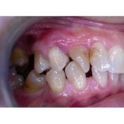 La paziente presenta parodontite ("piorrea") a carico della zona incisiva e premolare superiore. Sono presenti vecchi restauri in composito sui canini e sull'incisivo laterale di destra, mentre l'incisivo laterale di sinstra è rivestito in ceramica.