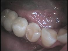 In seconda seduta, quando è ritornato confezionato dal laboratorio l’intarsio, isolo il dente con la diga di gomma e dopo aver adeguatamente condizionato la superficie del dente e dell’intarsio (sabbiatura, silanizzazione, ac. ortofosforico, ecc.) procedo alla cementazione. Il risultato è altamente estetico e, dato il tipo di procedura particolarmente accurata, è molto difficile che si presentino dolori alla pressione o alle escursioni termiche. Questa certezza mi permette di dire alla paziente che, a fronte di un’igiene dentale accettabile, il mio lavoro deve avere una vita di almeno 10 anni e che sotto tale periodo ogni problema relativo all’intarsio deve essere considerato a carico dello studio.