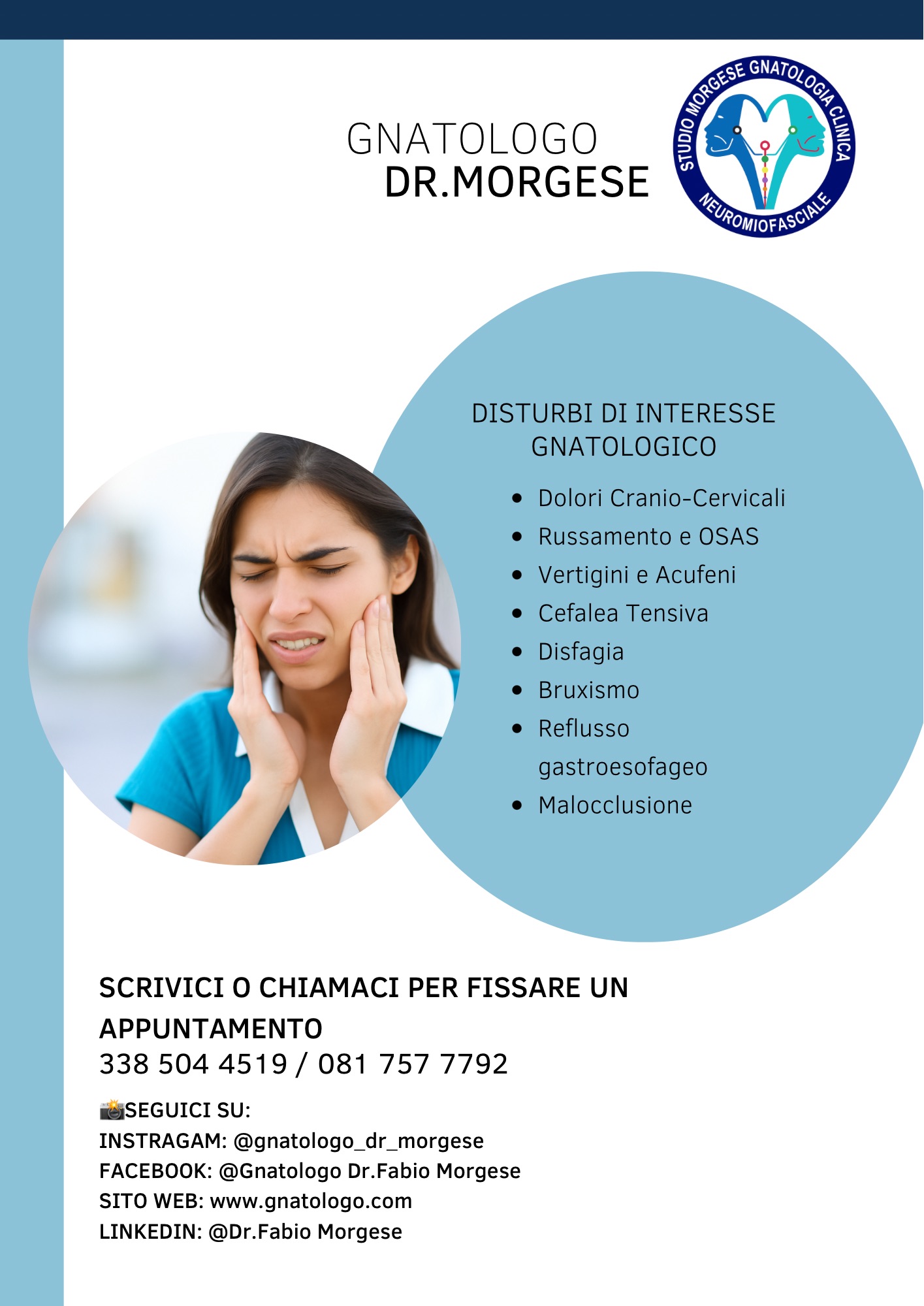 5077 visiteLa Gnatologia è il principale ambito di interesse dello Studio Morgese. Disturbi come bruxismo, cefalea muscolotensiva, cervicalgia, disordini temporomandibolari, dolore facciale, OSAS e russamento, disfagia, vertigini, acufeni, ovattamento auricolare e reflusso gastroesofageo vengono affrontati attraverso un approccio neuromiofasciale. Grande attenzione è riservata alla diagnosi transdisciplinare, che integra osservazioni cliniche, test funzionali da diverse discipline e indagini strumentali avanzate, come l’elettromiografia di superficie e la kinesiografia mandibolare computerizzata. Le terapie mirano a raggiungere una condizione di Neutro NeuroMioFasciale, ovvero lo stato funzionale ottimale del sistema analizzato. Questo processo inizia con l’identificazione di eventuali disfunzioni extrastomatognatiche che potrebbero interferire con il raggiungimento del neutro, e prosegue con la neuromodulazione mediante ulf-TENS. Una volta raggiunto il neutro, si procede alla rilevazione tridimensionale delle relazioni spaziali a livello stomatognatico, finalizzata alla realizzazione di dispositivi intraorali in grado di mantenere l’equilibrio funzionale, attraverso l' attivazione delle fibre afferenti trigeminali del sistema nervoso periferico (stimolazione propriocettiva).