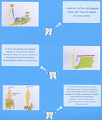 Quando queste fibre, per un motivo qualsiasi, ad esempio la Gengivite prima e poi la Parodontite, si dovessero rompere, esse si staccano dal dente, si apre quella porta e i microbi entrano e cominciano a distruggere il Parodonto, ossia il tessuto che sta intorno al dente, Gengiva, Cemento della radice, Legamento Parodontale che lega il dente all’osso e l’Osso stesso: è iniziata una Parodontite. (Conosciuta col termine volgare di "Piorrea" dal greco (puòn) marcio, pus - (roé) scolo, quindi scolo di pus. Scolo di pus, perché nei momenti conclamati o terminali della malattia si hanno numerosi ascessi! La distruzione di questi tessuti porta alla formazione di una tasca (ed infilo la mano dx nel taschino sin. del mio camice) spiegando "questa è una tasca, prima era cucita ora è aperta. Questa tasca si chiama "Tasca Parodontale". In pratica è come se fosse una ferita e come ogni ferita tenta di guarire facendo "granuleggiare" un tessuto che appunto si chiama di Granulazione, che cerca di chiudere questa ferita, ma non lo può fare per vari motivi che non sto ora a spiegare. La caratteristica di tutte le Parodontiti è quella di avere periodi di inattività che si alternano con altri di attività. Questo avviene in modo del tutto "anarchico". Ossia la malattia può essere attiva o non attiva, in tutta la bocca, in parte di essa o addirittura sullo stesso dente in un punto sì e nel punto vicino no!