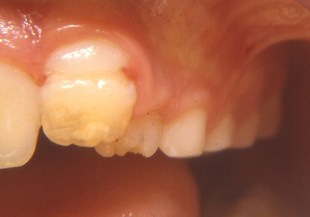 - anomalie di posizione e/o di eruzione (le più frequenti): il dente da latte traumatizzato crea la condizione negativa per la regolare eruzione del corrispondente permanente e questo permanente nasce male, tardi, storto etc etc perchè il dente da latte traumatizzato rappresenta un vero ostacolo, a causa della sua stessa patologia, alla crescita regolare del nuovo dente. Queste situazioni devono essere intercettate con l’avulsione tempestiva del deciduo (il concetto di “liberare la strada” per il permanente) o con il mantenimento od il ripristino dello spazio sull’arcata perchè: le malposizioni palatine determinano inversione del combaciamento anteriore e le malposizioni vestibolari conducono ad un irreversibile danno parodontale (eruzione in mucosa alveolare, ovvero davanti in alto, sopra il dente da latte che non cade).
