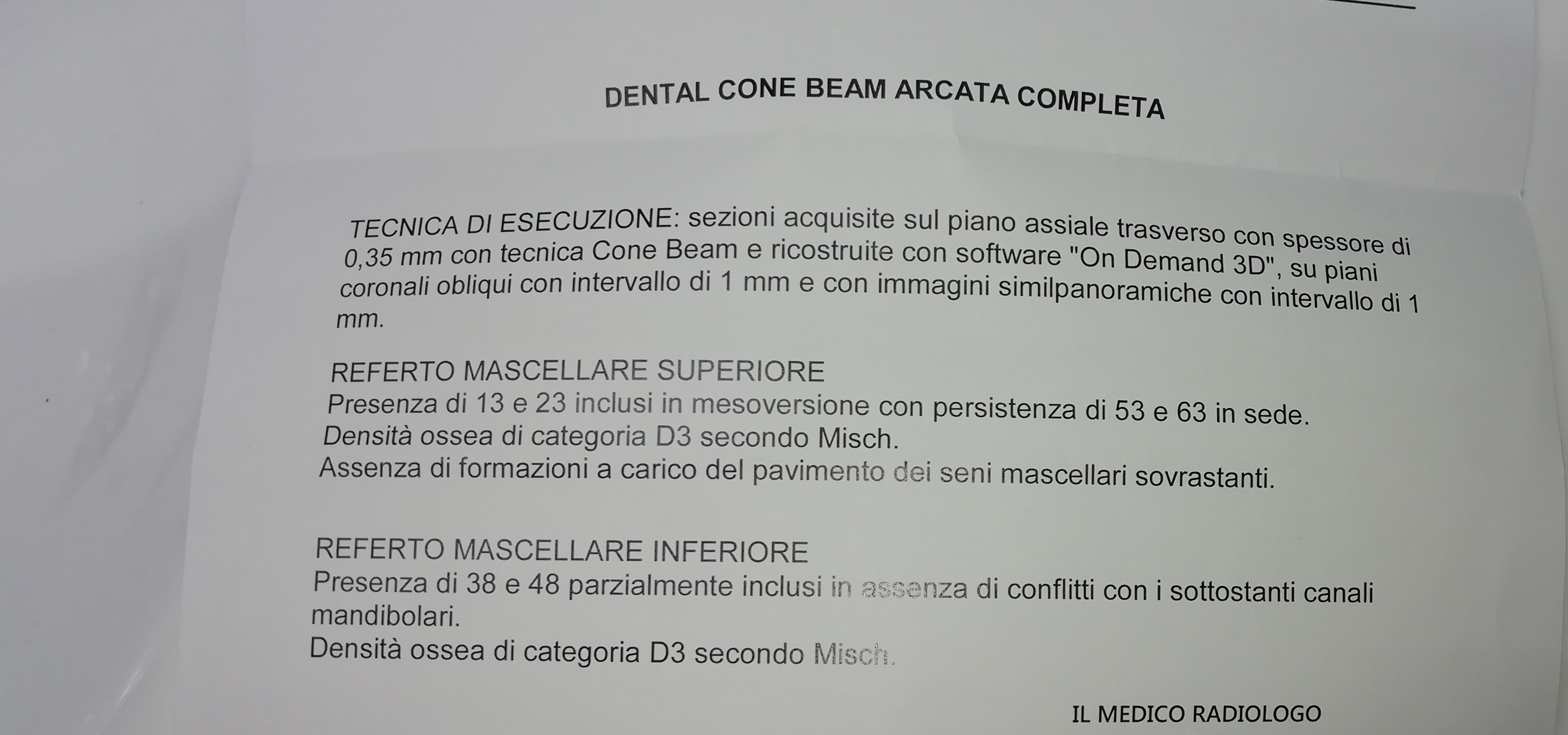 Buona sera, sono sempre stata seguita da una dentista in cui riponevo totale fiducia, la quale invece, evidentemente, è stata molto leggera e negligente nelle sue visite, tanto da aver scoperto solo recentemente (a più di 30 anni) di avere entrambi i canini superiori inclusi. Naturalmente ho totalmente perso fiducia nei suoi confronti e volendo cambiare medico, ho chiesto pareri ad altri due odontoiatri della mia città (Palermo). Il problema è che si trovano su posizioni diametralmente opposte, creando in me più dubbi che certezze. Il primo sostiene che sia assolutamente fattibile recuperare i canini inclusi, facendo preventivamente un percorso ortodontistico che prevede di estrarre gli ottavi, allargare il palato sopra e sotto, allineare (quindi creare lo spazio idoneo per i definitivi) e successivamente affrontare l'intervento per scoprire gli elementi inclusi e agganciarli. Il secondo mi dice che assolutamente non c'è nemmeno da provarci a recuperarli, e che quando cadranno quelli decidui poi si vedrà. In compenso mi riferisce che ho una brutta situazione con i canini dell'arcata inferiore, che non trovando un antagonista, si stanno spingendo verso l'alto al punto che potrei perderli! Quindi anche lui propone disgiuntori e allineatori, per il problema degli inclusi dice che metterebbe delle faccette su quelli decidui. Alla mia preoccupazione per il futuro risponde che si potranno fare degli impianti e non è detto che ciò comporti la rimozione dei definitivi dal palato (anche qui un parere esattamente opposto a quello del collega, che invece sostiene che in caso di impianto sarà indispensabile rimuovere tutto chirurgicamente). Adesso io veramente non so che fare e secondo quali criteri dovrei scegliere a chi affidarmi, o se sia il caso di sentire ulteriori pareri. Mi chiedo se, data la probabilità di doverli rimuovere completamente nel futuro per un impianto, non sarebbe più corretto affrontare oggi una chirurgia, sicuramente meno invasiva, per tentare il recupero, considerando anche che la capacità rigenerativa dei tessuti non può essere la stessa a 30 o 50 anni. Nella vostra esperienza quale è la probabilità di poter effettivamente recuperare dei denti inclusi in un adulto? A livello statistico, può valere la pena tentare? Grazie a chi vorrà rispondere, allego i dati diagnostici in mio possesso.