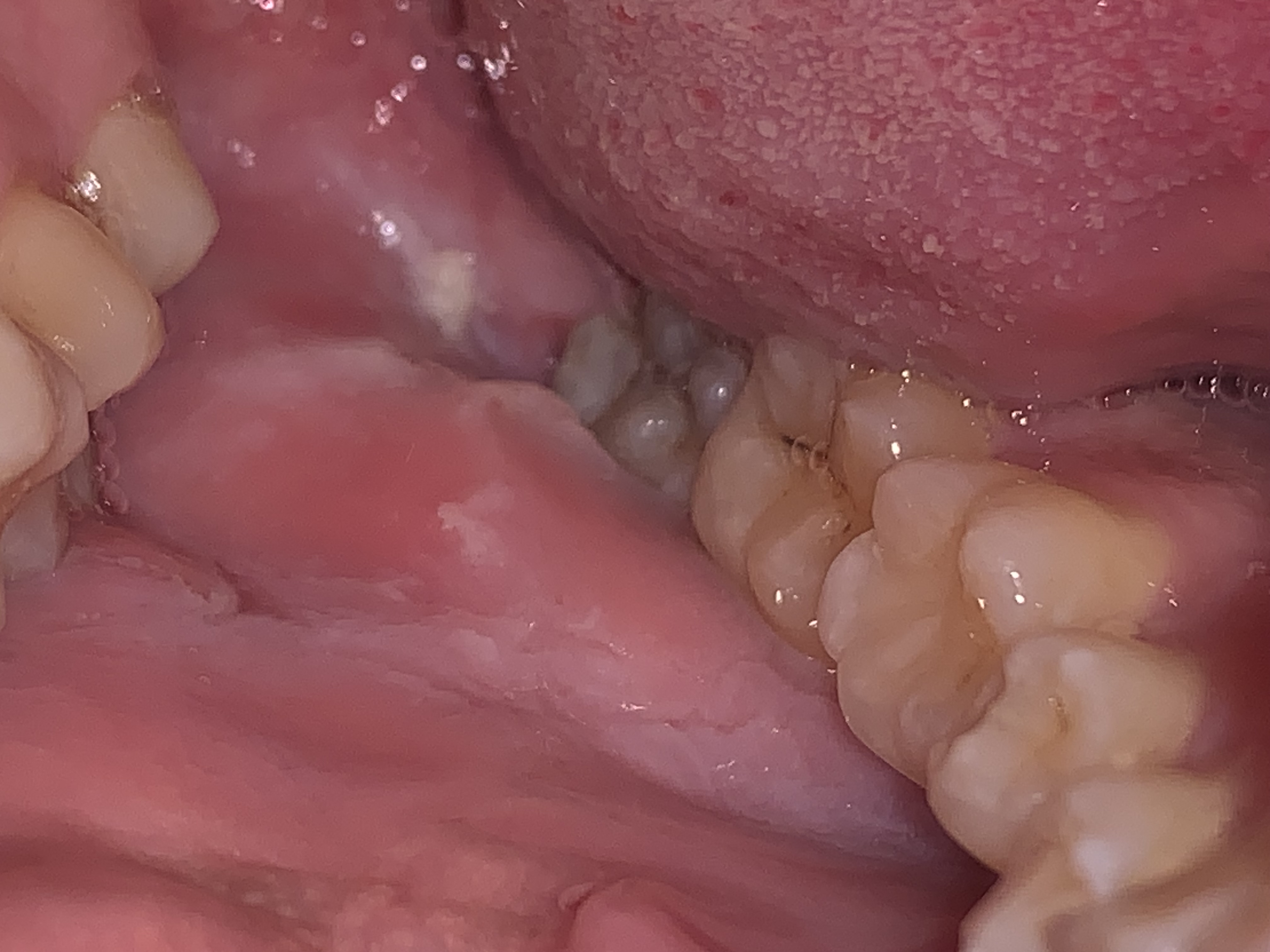 Ha detto anche che vorrebbe rimuovermi il dente del giudizio, che potrebbe sfregare e creare questo problema, ma solo nella sua zona e non a livello delle guance. La foto risale a più di due settimane fa, anche se la situazione risulta più o meno la stessa.